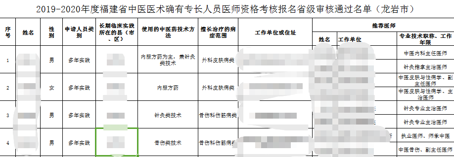 根據(jù)《福建省中醫(yī)醫(yī)術(shù)確有專長人員醫(yī)師資格考核注冊管理實施細(xì)則(試行)》(閩衛(wèi)中〔2018〕828號)和《福建省中醫(yī)醫(yī)術(shù)確有專長人員醫(yī)師資格考務(wù)管理辦法》(閩衛(wèi)中醫(yī)函〔2019〕458號)規(guī)定,福建省衛(wèi)健委于2019年11月啟動2019-2020年度福建省中醫(yī)醫(yī)術(shù)確有專長人員醫(yī)師資格考核報名工作。經(jīng)縣(市、區(qū))級衛(wèi)生健康行政部門組織報名及初審,設(shè)區(qū)市級、省級衛(wèi)生健康行政部門逐級復(fù)審,共有1364名中醫(yī)醫(yī)術(shù)確有專長人員符合考核條件。按照相關(guān)規(guī)定,現(xiàn)將符合考核條件的中醫(yī)醫(yī)術(shù)確有專長人員、指導(dǎo)老師和推薦醫(yī)師信息在省內(nèi)公示,接受社會各界監(jiān)督,公示期從2021年1月7日至1月13日。公示期間對公示信息如有異議,請實名向福建省衛(wèi)健委反映(聯(lián)系電話:0591-87833674,郵寄地址:福州市鼓屏路61號,福建省衛(wèi)健委中醫(yī)處收,信函以寄出日郵戳為準(zhǔn))。