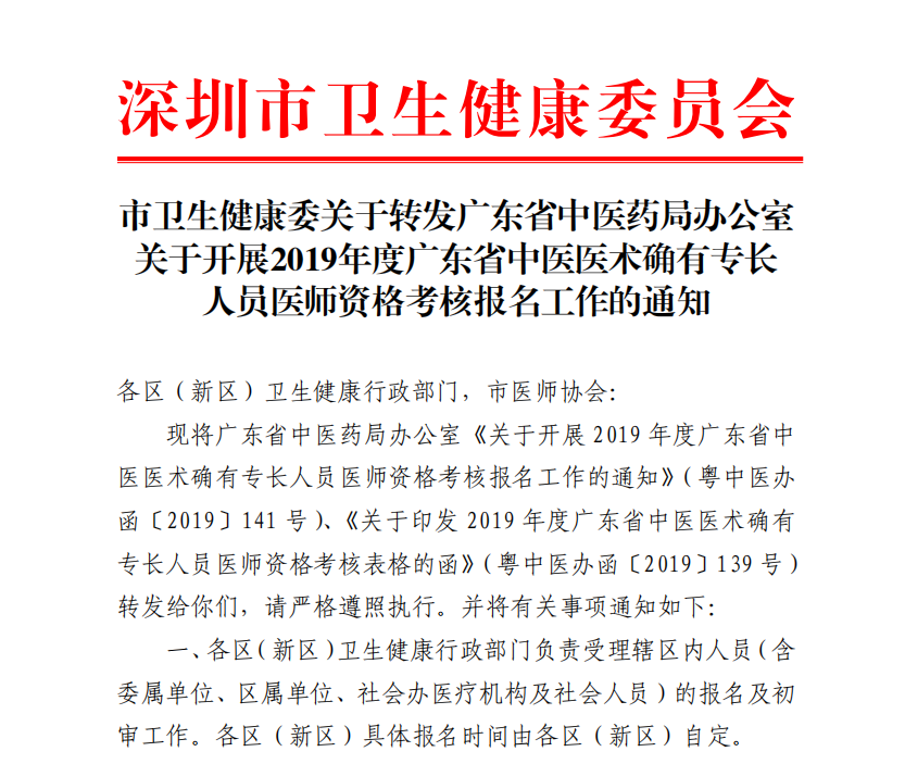 深圳市醫(yī)師學會發(fā)布市衛(wèi)生健康委關于轉發(fā)廣東省中醫(yī)藥局辦公室關于開展2019年度廣東省中醫(yī)醫(yī)術確有專長人員醫(yī)師資格考核報名工作的通知,為幫助大家了解,在此醫(yī)學教育網小編為大家整理如下內容: