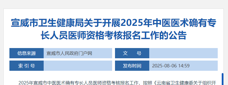 宣威市衛(wèi)生健康局關(guān)于開展2025年中醫(yī)醫(yī)術(shù)確有專長人員醫(yī)師資格考核報名工作的公告公布啦!醫(yī)學(xué)教育網(wǎng)整理具體內(nèi)容如下: