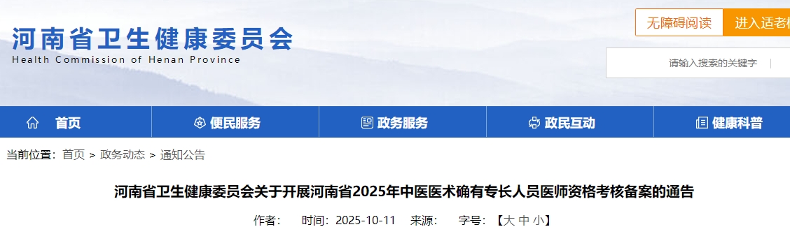 河南省衛(wèi)生健康委員會關(guān)于開展河南省2025年中醫(yī)醫(yī)術(shù)確有專長人員醫(yī)師資格考核備案的通告公布啦!醫(yī)學(xué)教育網(wǎng)整理具體內(nèi)容如下: