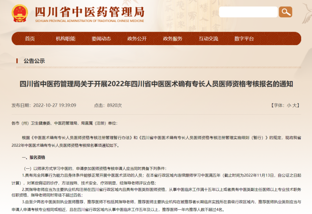關(guān)于開(kāi)展2022年四川省各地中醫(yī)醫(yī)術(shù)確有專(zhuān)長(zhǎng)人員醫(yī)師資格考核報(bào)名的通知
