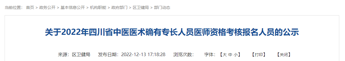 根據(jù)《四川省中醫(yī)藥管理局關(guān)于開展2022年四川省中醫(yī)醫(yī)術(shù)確有專長人員醫(yī)師資格考核報(bào)名的通知》和《四川省中醫(yī)醫(yī)術(shù)確有專長人員醫(yī)師資格考核注冊管理實(shí)施細(xì)則(暫行)》的規(guī)定,現(xiàn)對我區(qū)2名2022年中醫(yī)醫(yī)術(shù)確有專長人員醫(yī)師資格考核報(bào)名人員信息予以公示(詳見附件),公示時(shí)間為2022年12月14日至12月22日。廣大群眾如有異議,請?jiān)诠局掌?個(gè)工作日內(nèi)向龍泉驛區(qū)衛(wèi)生健康局中醫(yī)科反映。