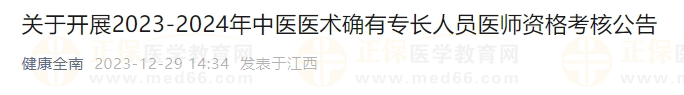 根據(jù)《中醫(yī)醫(yī)術(shù)確有專長人員醫(yī)師資格考核注冊管理暫行辦法》(國家衛(wèi)計委第15號令)規(guī)定,現(xiàn)就2023-2024年江西省中醫(yī)醫(yī)術(shù)確有專長人員醫(yī)師資格考核有關(guān)事項通告如下: