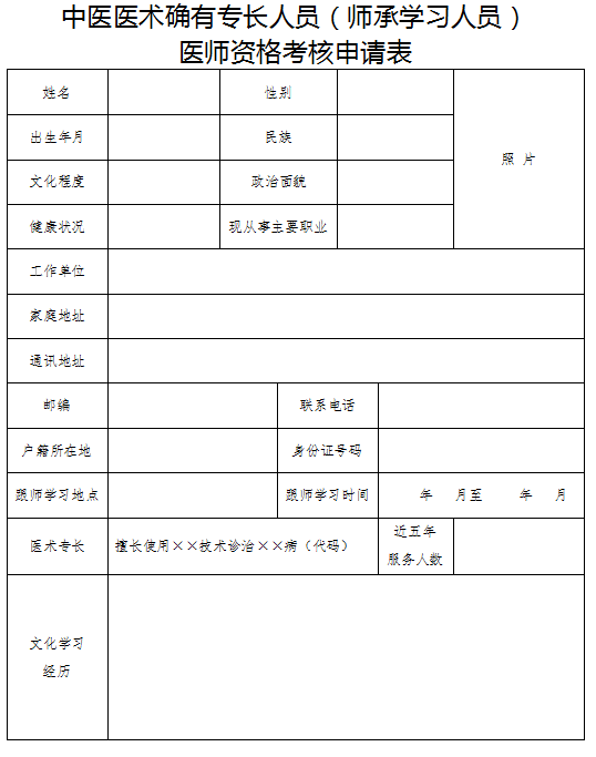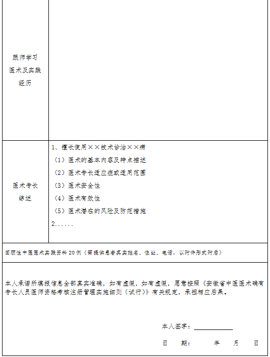1.本表供中醫(yī)醫(yī)術(shù)確有專長(zhǎng)人員(師承學(xué)習(xí)人員)申請(qǐng)參加醫(yī)師資格考核時(shí)使用。
