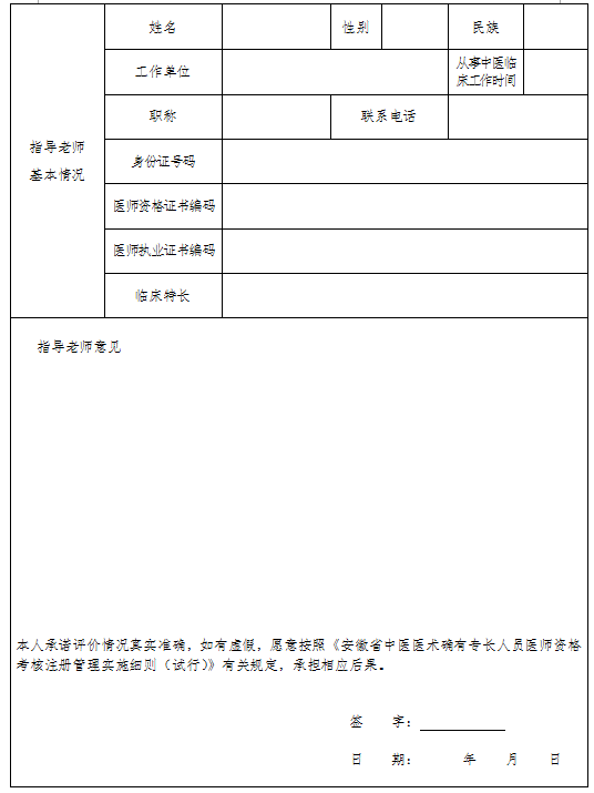 13.指導(dǎo)老師基本情況:需附指導(dǎo)老師醫(yī)師資格證書(shū)、醫(yī)師執(zhí)業(yè)證書(shū)復(fù)印件,中醫(yī)類副主任醫(yī)師以上專業(yè)技術(shù)職務(wù)任職資格證書(shū)復(fù)印件或者指導(dǎo)老師工作單位出具的從事中醫(yī)臨床工作十五年以上證明材料。