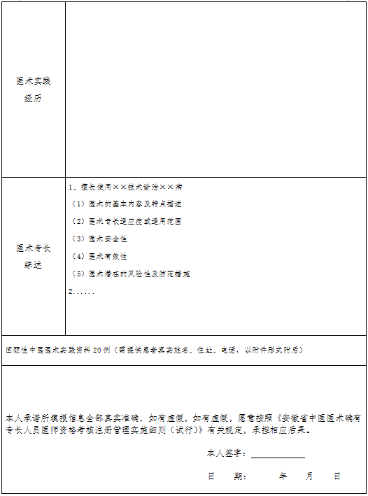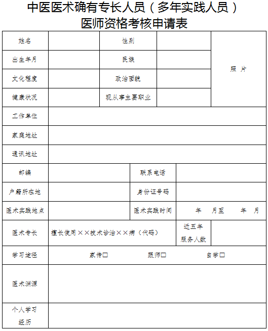 1.本表供中醫(yī)醫(yī)術(shù)確有專長人員(多年實(shí)踐人員)申請(qǐng)參加醫(yī)師資格考核時(shí)使用。