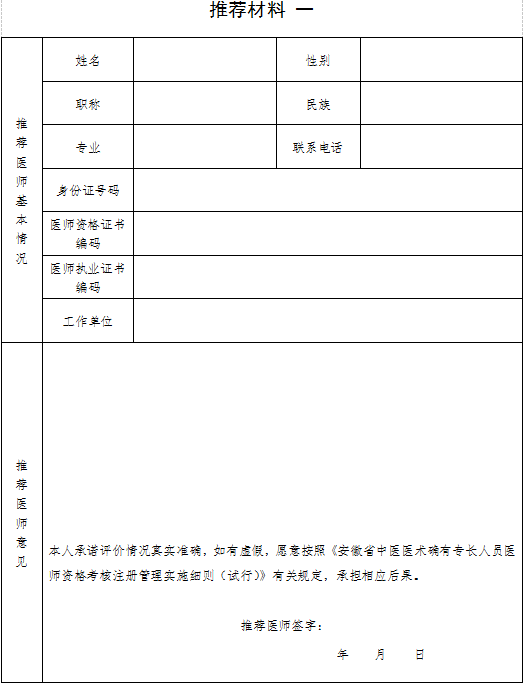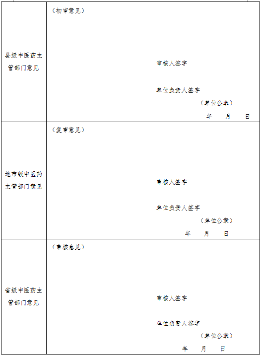 3.第1——2頁由申請(qǐng)人填寫,第3-4頁由推薦醫(yī)師填寫,第5頁由各級(jí)中醫(yī)藥主管部門填寫。