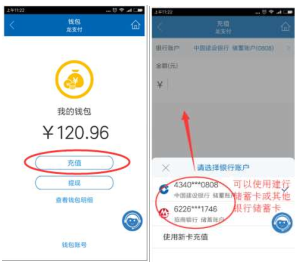 3.龍支付錢包充值。點擊充值,選擇相應賬號,輸入金額,將賬號的金額轉入至錢包。