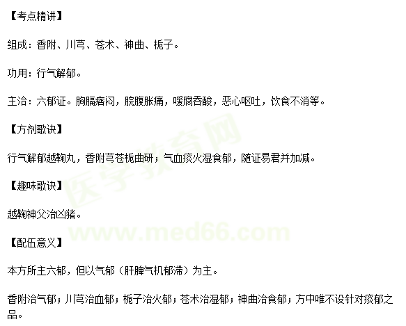關于“中醫(yī)醫(yī)術確有專長方劑歌訣考點:越鞠丸的功效與作用”相關內(nèi)容,相信參加中醫(yī)醫(yī)師確有專長考核的考生都想知道, 為幫助大家了解,在此醫(yī)學教育網(wǎng)小編為大家整理如下內(nèi)容: