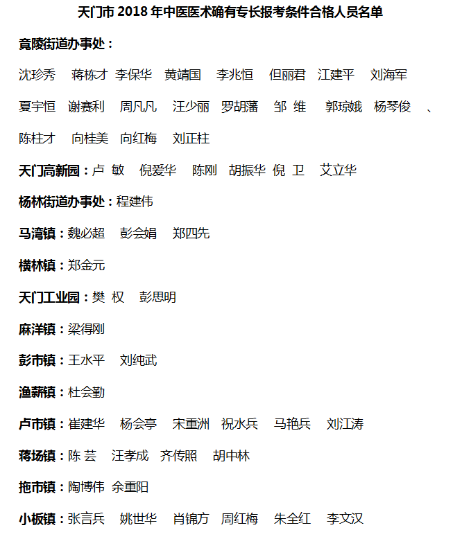 以下為天門市2018年中醫(yī)醫(yī)術(shù)確有專長報(bào)考條件合格人員名單: