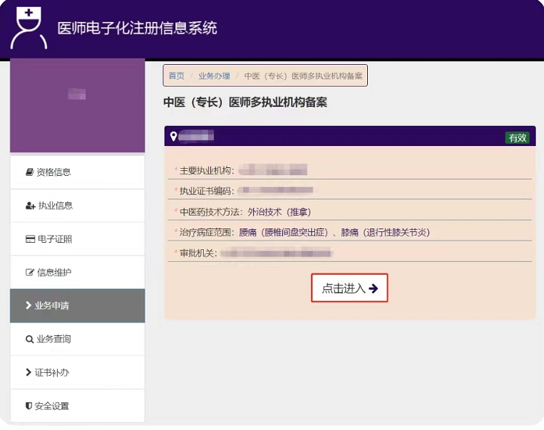 2、點擊當前執(zhí)業(yè)信息下【點擊進入】按鈕。