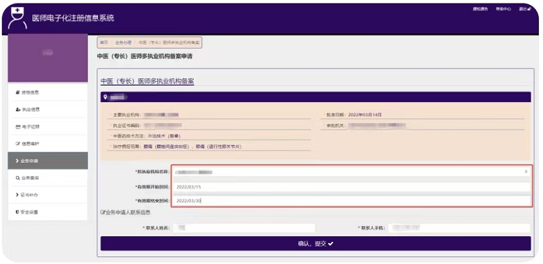 3、在中醫(yī)(專長)醫(yī)師多執(zhí)業(yè)機構(gòu)備案頁面,選擇要多執(zhí)業(yè)機構(gòu)備案的機構(gòu),填寫“有效期開始時間”和“有效期結(jié)束時間”,然后點擊【確認,下一步】按鈕。