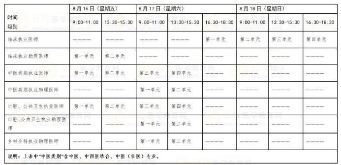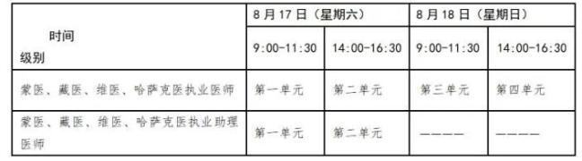 考試實(shí)行計(jì)算機(jī)化考試。軍隊(duì)現(xiàn)役人員加試軍事醫(yī)學(xué)、院前急救崗位和兒科專業(yè)加試相應(yīng)內(nèi)容。中醫(yī)類別藏醫(yī)專業(yè)實(shí)行紙筆考試。統(tǒng)一考試時(shí)間如下: