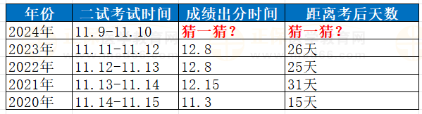 醫(yī)師“一年兩試”考試成績(jī)一般在考后一個(gè)月內(nèi)公布,參考2023年醫(yī)師資格考試(二試)考試成績(jī)公布日期為12月8日。近幾年二試考試時(shí)間逐漸提前,所以預(yù)計(jì)出分速度也會(huì)越來(lái)越快。參考今年一試成績(jī)提前一周公布,所以今年二試成績(jī)公布很可能也會(huì)提前,所以各位考生一定要提前預(yù)約訂閱成績(jī)動(dòng)態(tài)提醒!