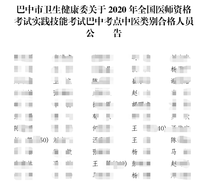 四川巴中2020年中醫(yī)助理醫(yī)師實踐技能考試成績合格人員名單