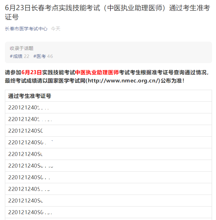 請參加6月23日實踐技能考試中醫(yī)執(zhí)業(yè)助理醫(yī)師考試考生根據(jù)準(zhǔn)考證號查詢通過情況,最終考試成績請以國家醫(yī)學(xué)考試網(wǎng)(http://www.nmec.org.cn/)公布為準(zhǔn)!