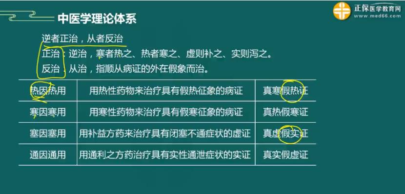 (2)反治:指順從病證的外在假象而治的一種治療原則。適用于疾病的征象與其本質(zhì)不相符的病證,即病有假象者。又稱為“從治”。包括:①熱因熱用,即以熱治熱,是用熱性藥物來(lái)治療具有假熱征象的病證。適用于陰盛格陽(yáng)的真寒假熱證。②寒因寒用,即以寒治寒,是用寒性藥物來(lái)治療具有假寒征象的病證。適用于陽(yáng)盛格陰的真熱假寒證。③塞因塞用,即以補(bǔ)開(kāi)塞,是用補(bǔ)益藥物來(lái)治療具有閉塞不通癥狀的虛證。適用于“至虛有盛候”的真虛假實(shí)證。④通因通用,即以通治通,是用通利的藥物來(lái)治療具有通瀉癥狀的實(shí)證。適用于“大實(shí)有羸狀”的真實(shí)假虛證。