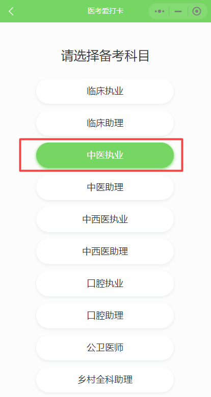第二步、掃描之后會進入如下截圖頁面,請點擊“進入小程序”按鈕,然后“選擇您的備考類別”,例如中醫(yī)執(zhí)業(yè)醫(yī)師:
