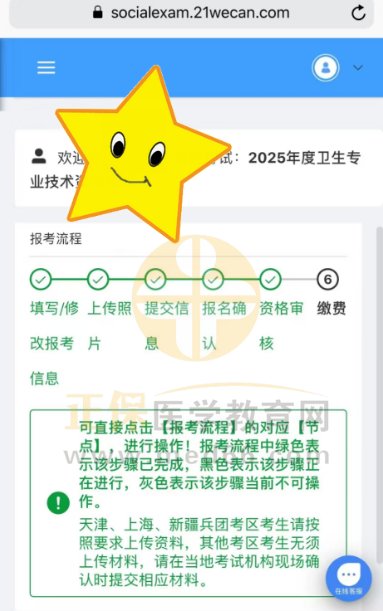 醫(yī)學(xué)教育網(wǎng)提醒各位考生,通過資格審核后須在2025年2月7-16日期間登錄考生管理平臺完成網(wǎng)上繳費,未按期完成繳費者視為主動放棄本次考試。