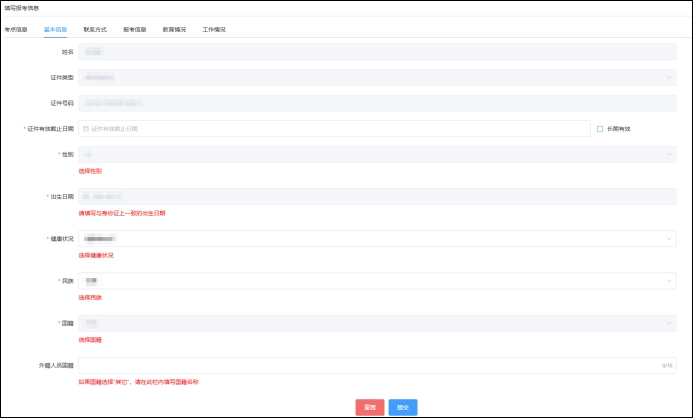 進(jìn)入填寫報(bào)考信息頁(yè)面,系統(tǒng)將默認(rèn)顯示上一年度的報(bào)名信息。考生須逐頁(yè)核對(duì)基本信息、聯(lián)系方式、報(bào)考信息、教育情況、工作情況,可根據(jù)本年度報(bào)名的實(shí)際情況修改,確認(rèn)無(wú)誤后點(diǎn)擊提交。