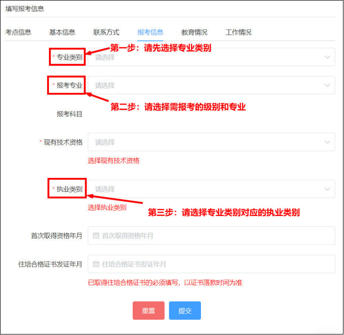 考生須根據(jù)所選的專業(yè)類別,勾選對(duì)應(yīng)的執(zhí)業(yè)類別,執(zhí)業(yè)類別不為“無(wú)”時(shí),首次注冊(cè)年月不能為空。