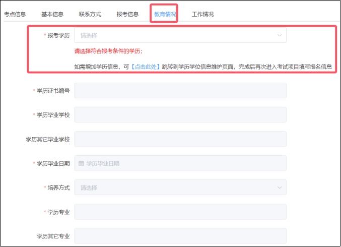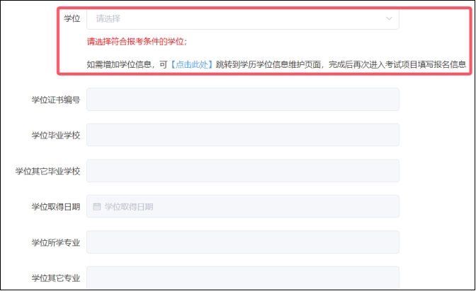 (5)報(bào)考學(xué)歷和學(xué)位相關(guān)信息下拉選擇,引用基本信息中【學(xué)歷學(xué)位信息維護(hù)】的內(nèi)容。如需修改,請(qǐng)?jiān)趯W(xué)歷學(xué)位信息維護(hù)頁(yè)面進(jìn)行操作,完成后再次進(jìn)入考試項(xiàng)目填寫報(bào)考信息,引用正確的學(xué)歷和學(xué)位信息。