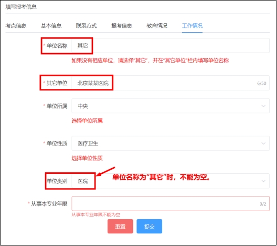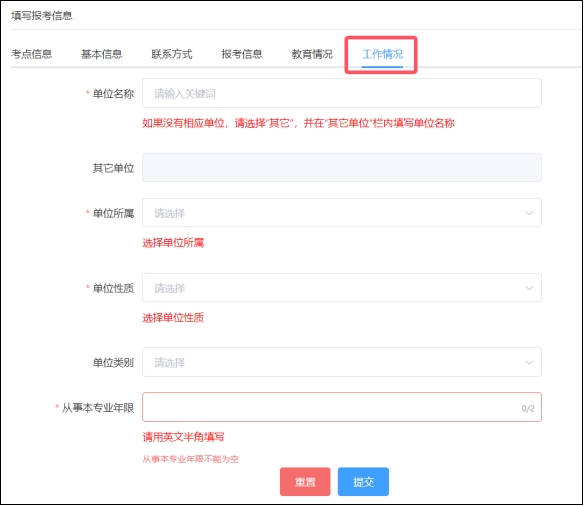 (6)填寫工作情況,包括“單位名稱”、“單位所屬”、“單位性質(zhì)”、“單位類別”和“從事本專業(yè)年限”。
