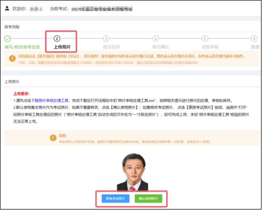 (7)以上信息提交后,系統(tǒng)會(huì)自動(dòng)跳轉(zhuǎn)至上傳照片頁(yè)面,也可點(diǎn)擊【報(bào)考流程】中的“上傳照片”節(jié)點(diǎn),進(jìn)入功能區(qū)上傳照片。默認(rèn)引用注冊(cè)照片,如無(wú)需修改,點(diǎn)擊“確認(rèn)使用照片”;如需更換照片,下載照片審核處理工具對(duì)新照片處理后點(diǎn)擊“更換考試照片”,選擇處理后的新照片即可。