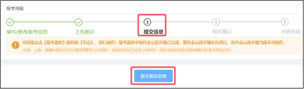 (8)上傳照片后系統(tǒng)將跳轉(zhuǎn)至【提交報(bào)名信息】頁(yè),考生也可點(diǎn)擊【報(bào)考流程】中的“提交信息”節(jié)點(diǎn),確認(rèn)無(wú)誤后點(diǎn)擊“提交報(bào)名信息”。