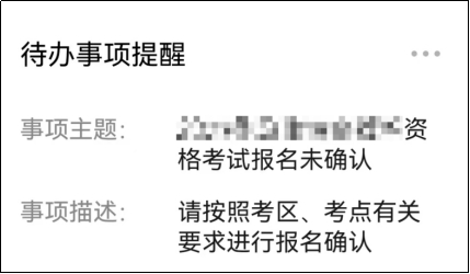 提交信息后,中國(guó)衛(wèi)生人才網(wǎng)微信公眾號(hào)會(huì)向考生綁定的微信發(fā)出報(bào)名未確認(rèn)的“待辦事項(xiàng)提醒”(如下圖),考生須按照所在考區(qū)、考點(diǎn)要求完成報(bào)名確認(rèn)。