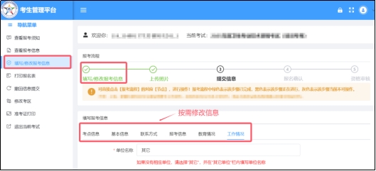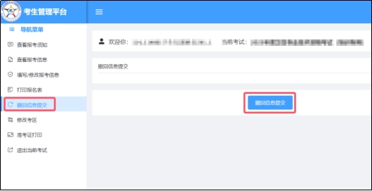 未進(jìn)行報(bào)名確認(rèn)的考生,可在報(bào)名確認(rèn)結(jié)束前點(diǎn)擊“撤回信息提交”,通過【填寫/修改報(bào)考信息】功能修改相應(yīng)信息,修改完成后須再次提交并重新打印報(bào)名表。