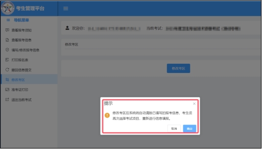 修改考區(qū)操作將會(huì)清空此項(xiàng)目下已經(jīng)填寫的報(bào)名信息,但不影響注冊(cè)信息和基本信息。