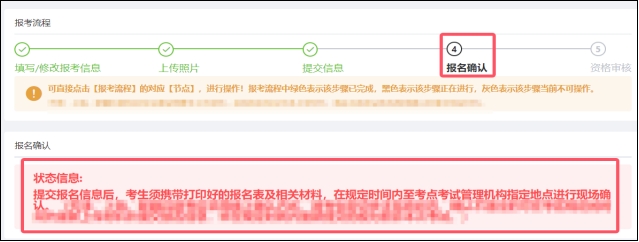 提交報(bào)名信息后,考生須按照當(dāng)?shù)乜荚嚬芾頇C(jī)構(gòu)的要求,在規(guī)定的時(shí)間內(nèi),攜帶報(bào)名表和相關(guān)材料前往指定地點(diǎn)進(jìn)行報(bào)名確認(rèn)。經(jīng)報(bào)名點(diǎn)或考點(diǎn)確認(rèn)報(bào)名信息后,“報(bào)名確認(rèn)”節(jié)點(diǎn)變?yōu)榫G色。