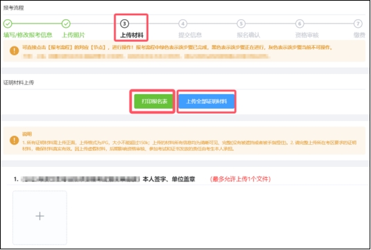 報(bào)考信息填寫完成后,系統(tǒng)將跳轉(zhuǎn)至【上傳材料】頁(yè),考生也可點(diǎn)擊報(bào)考流程中的【上傳材料】節(jié)點(diǎn)進(jìn)入上傳材料頁(yè)面。考生可先點(diǎn)擊“打印報(bào)名表”,下載并打印報(bào)名申請(qǐng)表,然后按照考區(qū)的要求上傳相關(guān)證明材料。