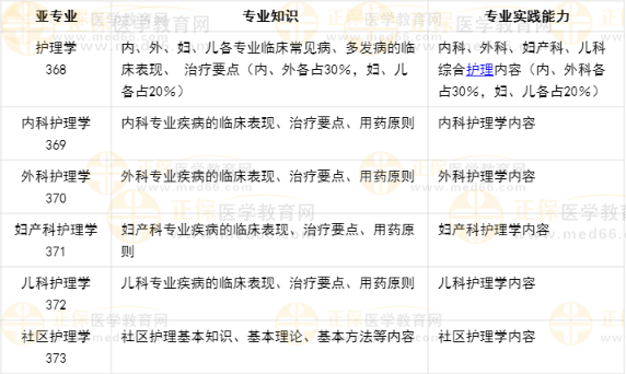 所有專業(yè)的主管護師考生以上兩份試卷的考試內(nèi)容都一樣,368是主專業(yè)-護理學(xué)的代碼、369~373依次是亞專業(yè)內(nèi)、外、婦、兒、社區(qū)護理學(xué)的代碼,不同專業(yè)代碼的考生,后兩份試卷的考試內(nèi)容如下: