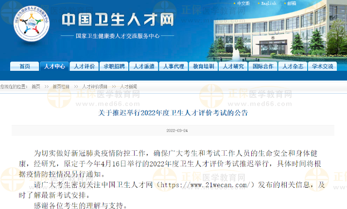 為切實(shí)做好新冠肺炎疫情防控工作,確保廣大考生和考試工作人員的生命安全和身體健康,經(jīng)研究,原定于今年4月9、10、16、17日舉行的2022年度衛(wèi)生專業(yè)技術(shù)資格考試推遲舉行,具體時間將根據(jù)疫情防控情況另行通知。