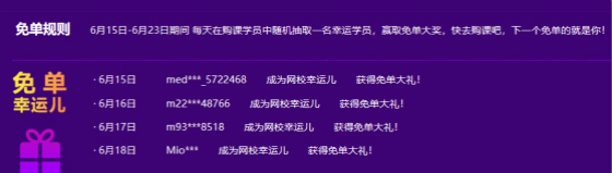 活動期間每天在購課學員中隨機抽取一名幸運學員贏取免單大獎,心動就快來吧!