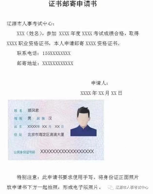1.考生須關(guān)注“遼源市人事考試中心”微信公眾號(hào),查看歷史消息-“關(guān)于專業(yè)技術(shù)資格考試遼源考區(qū)合格人員證書郵寄方式的通知”,按照“證書郵寄申請(qǐng)書”圖片示例(圖片在下方)要求,填寫證書領(lǐng)取相關(guān)信息,并做成圖片,發(fā)送至QQ郵箱(1343160563@qq.com),辦理證書郵寄。