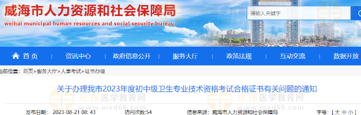 威海市人力資源和社會保障局發(fā)布關(guān)于辦理我市2023年度初中級衛(wèi)生專業(yè)技術(shù)資格考試合格證書有關(guān)問題的通知,醫(yī)學(xué)教育網(wǎng)整理具體內(nèi)容如下:
