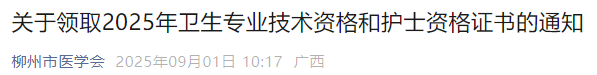 參加2025年衛(wèi)生專業(yè)技術(shù)資格和護(hù)士執(zhí)業(yè)資格考試且成績合格的廣西考區(qū)柳州市考點(diǎn)的考生,從2025年9月1日起可領(lǐng)取資格證書,現(xiàn)就領(lǐng)取證書的相關(guān)事宜通知如下: