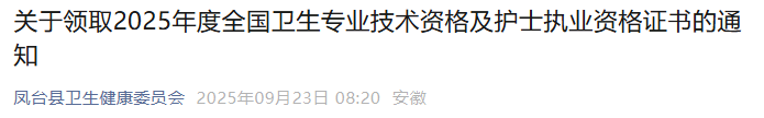參加2025年全國(guó)衛(wèi)生專業(yè)技術(shù)資格考試及護(hù)士執(zhí)業(yè)資格考試且成績(jī)合格的鳳臺(tái)縣考生,自2025年9月23日起可領(lǐng)取衛(wèi)生專業(yè)技術(shù)資格及護(hù)士執(zhí)業(yè)資格證書?,F(xiàn)將證書領(lǐng)取事宜通知如下: