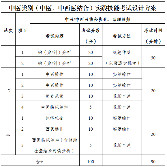 2.按照《國(guó)家衛(wèi)生健康委員會(huì)醫(yī)師資格考試委員會(huì)關(guān)于印發(fā)醫(yī)師資格考試實(shí)踐技能考試實(shí)施方案(臨床類別,中醫(yī)類別中醫(yī)、中西醫(yī)結(jié)合)(2020年版)的通知》(國(guó)衛(wèi)醫(yī)考委發(fā)〔2020〕5號(hào))要求,對(duì)臨床類別和中醫(yī)類別(中醫(yī)、中西醫(yī)結(jié)合專業(yè))實(shí)踐技能考試方案進(jìn)行了修訂,新修訂的考試設(shè)計(jì)方案為: