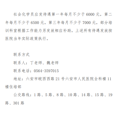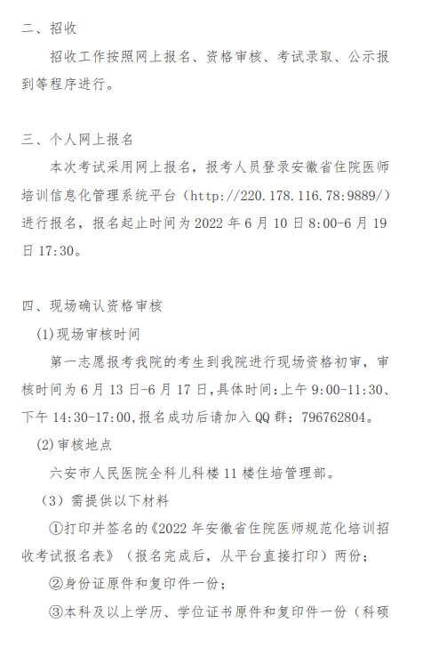 以上就是“六安市人民醫(yī)院2022年住院醫(yī)師規(guī)范化培訓(xùn)招生簡章”的全部內(nèi)容,由醫(yī)學(xué)教育網(wǎng)小編整理,希望對您有所幫助!想要了解更多關(guān)于住院醫(yī)師規(guī)范化培訓(xùn)考試相關(guān)政策,請繼續(xù)關(guān)注此欄目!
