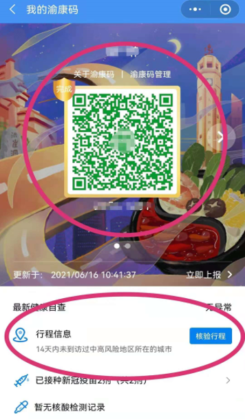 所有來院考生需提供7月21日渝康碼彩色打印紙質(zhì)件:要求必須為“綠碼”且“14天內(nèi)未到過中高風(fēng)險地區(qū)所在城市”。(微信搜索小程序“重慶健康出行一碼通”→我的渝康碼→核驗行程→截圖彩色打印,如圖所示)。考生若有發(fā)熱干咳等癥狀請?zhí)崆皥髠洹?/p>