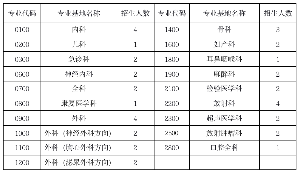 注:全科、兒科、婦產(chǎn)科、麻醉科、急診科、康復(fù)醫(yī)學(xué)科為緊缺專業(yè),不受招生計劃人數(shù)限制。