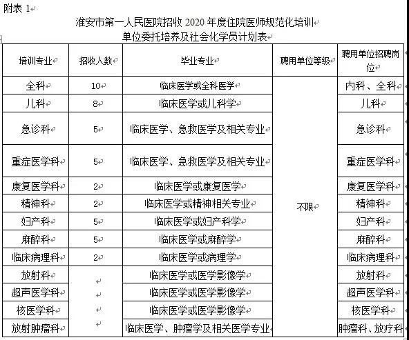 根據(jù)江蘇省衛(wèi)健委要求并結(jié)合我院各專業(yè)基地的實(shí)際培訓(xùn)能力,制定了明確的招收計(jì)劃(詳見(jiàn)附件1:《淮安市第一人民醫(yī)院招收2020年度住院醫(yī)師規(guī)范化培訓(xùn)單位委托培養(yǎng)及社會(huì)化學(xué)員計(jì)劃表》)。