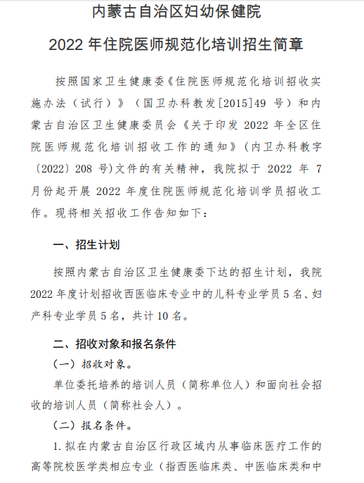 相關(guān)附件:內(nèi)蒙古自治區(qū)婦幼保健院2022年住院醫(yī)師規(guī)范化培訓(xùn)招生簡章