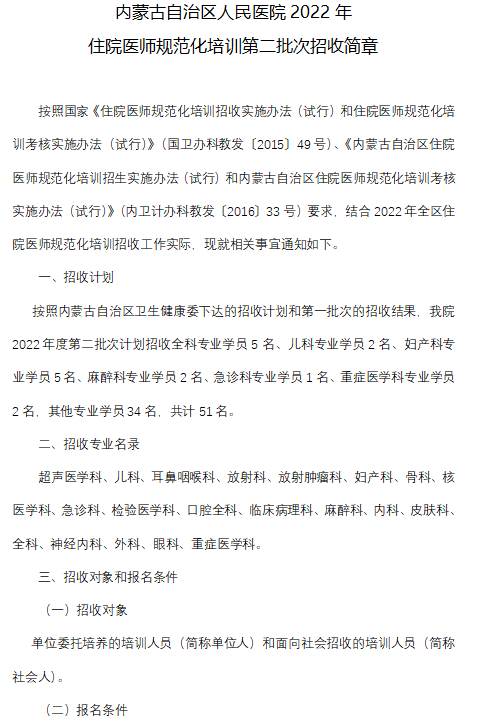 相關(guān)附件: 內(nèi)蒙古自治區(qū)人民醫(yī)院2022年住院醫(yī)師規(guī)范化培訓(xùn)第二批次招收簡章