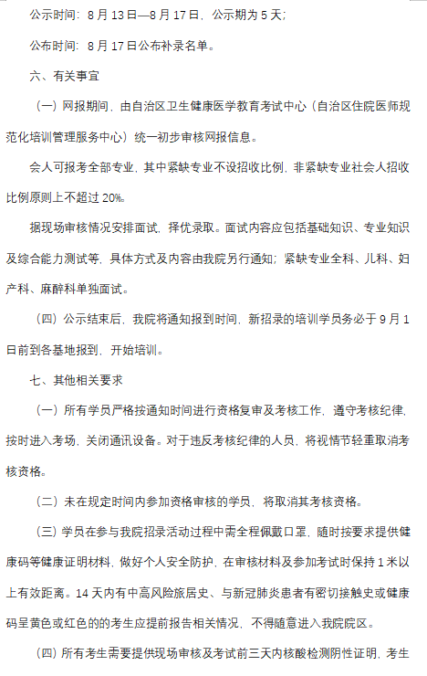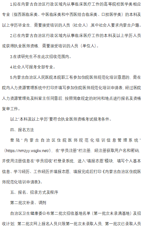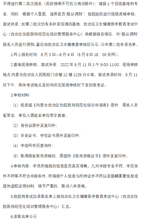 以上就是“內(nèi)蒙古自治區(qū)人民醫(yī)院2022年住院醫(yī)師規(guī)范化培訓(xùn)第二批次招收簡章”的全部內(nèi)容,由醫(yī)學(xué)教育網(wǎng)小編整理,希望對您有所幫助!想要了解更多關(guān)于住院醫(yī)師規(guī)范化培訓(xùn)考試相關(guān)政策,請繼續(xù)關(guān)注此欄目!