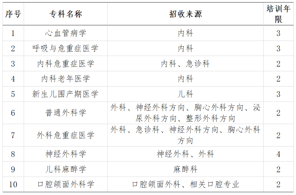 1.主要招收完成住院醫(yī)師規(guī)范化培訓(xùn)(以下簡(jiǎn)稱住培)取得合格證書(shū)并自愿參加專培的臨床醫(yī)師,專培招收來(lái)源見(jiàn)附表。